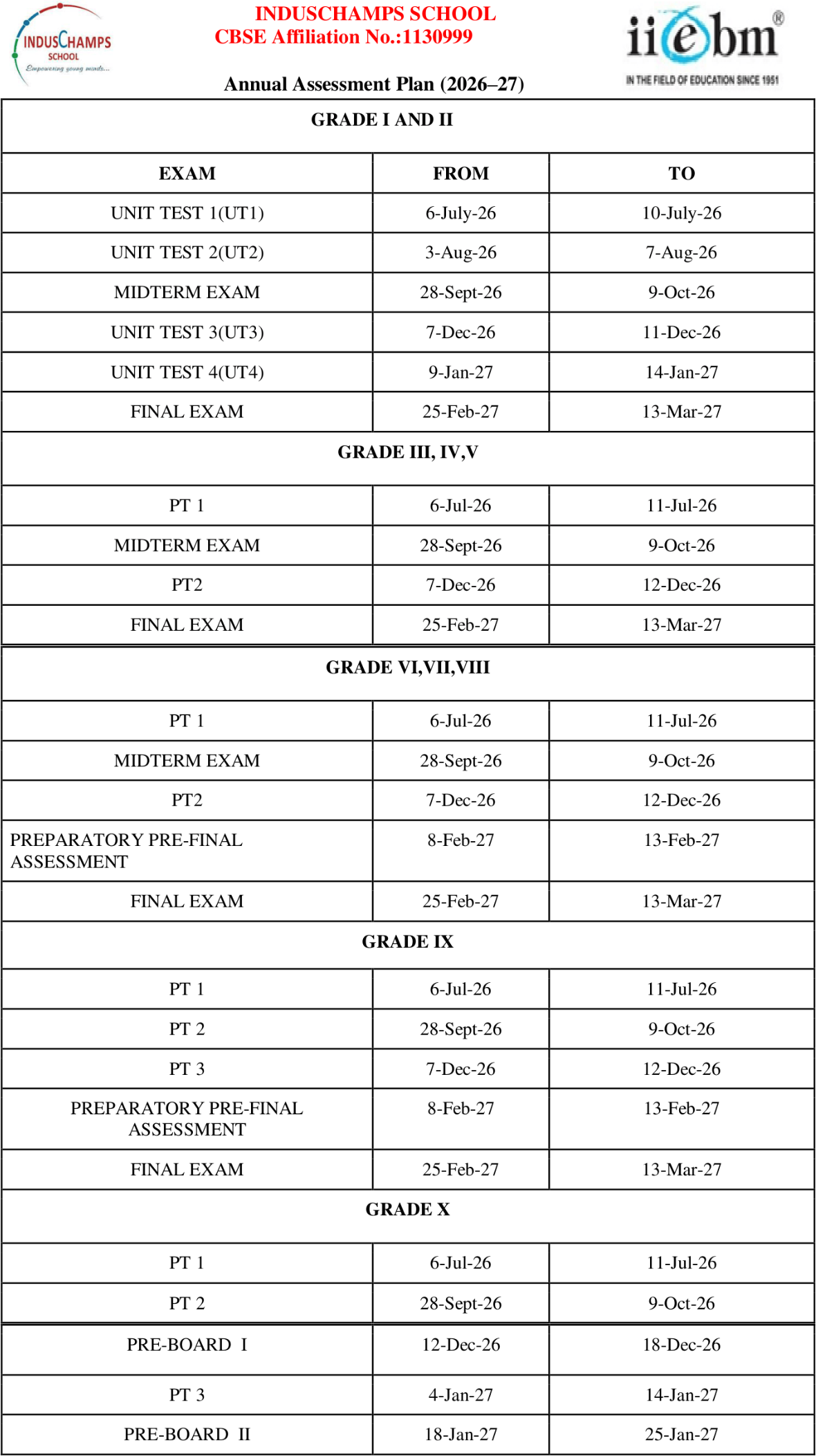 IndusChamps School CBSE Affiliation No: 1130999 | Annual Assessment Plan -2026-27